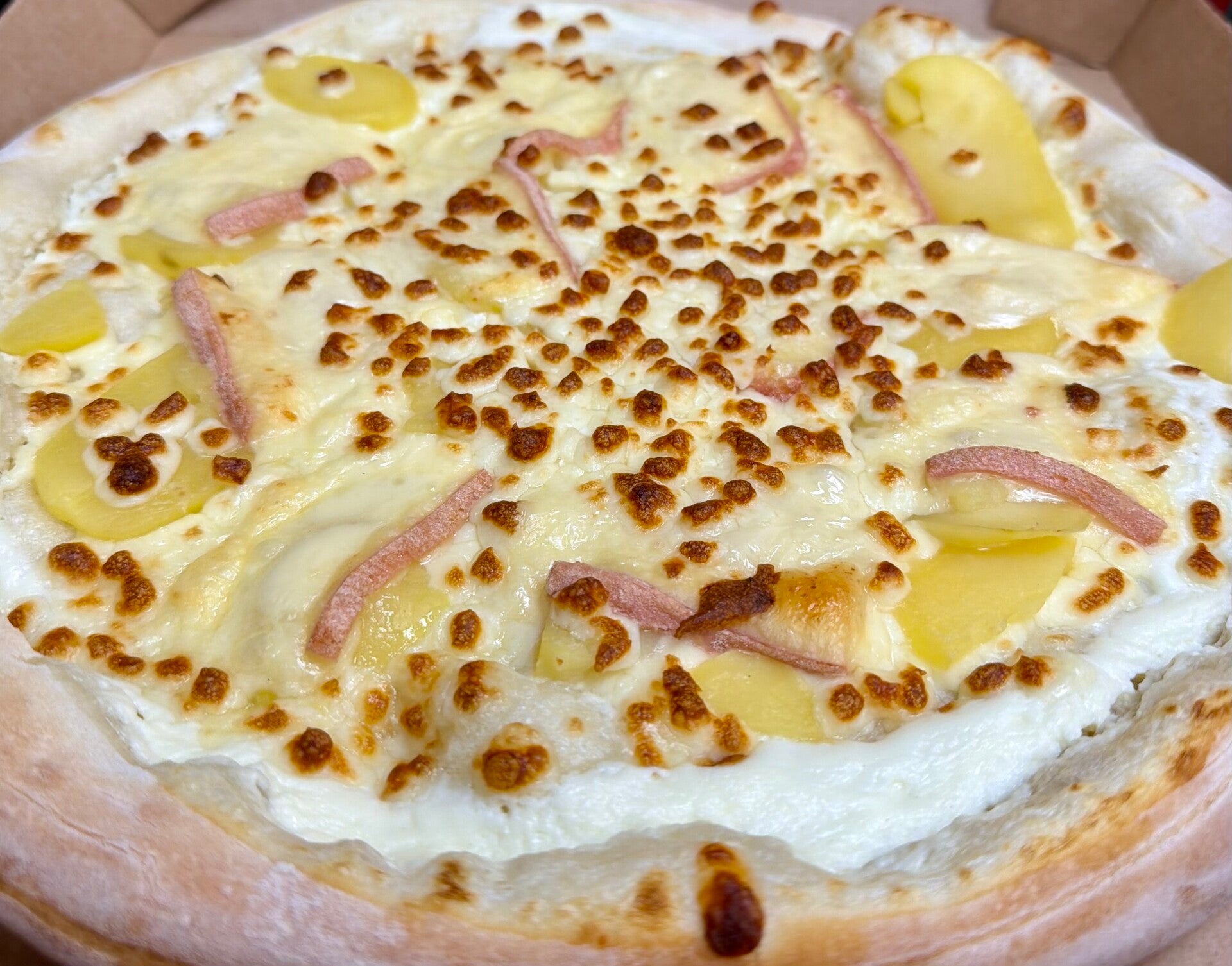| Campagnarde | Crème fraîche, mozzarella, lardons, pomme de terre, oignons | 12.90 € |